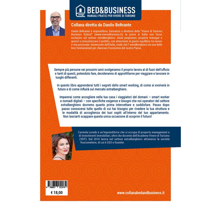 Sempre più persone nei prossimi anni svolgeranno il proprio lavoro al di fuori dell'ufficio e tanti di questi, potendolo fare, decideranno di approfittarne per viaggiare e lavorare in luoghi differenti. In questo libro apprenderai tutti i segreti dello smart working, di come si evolverà in futuro e di come influirà sul mercato extralberghiero. Imparerai come accogliere nella tua casa i viaggiatori del domani - smart worker e nomadi digitali -, con specifiche esigenze e bisogni che noi operatori del settore extralberghiero dovremo quanto prima intercettare e soddisfare. Passo dopo passo conoscerai tutto quello di cui hai bisogno per rivedere la tua struttura e le modalità di accoglienza dei tuoi ospiti all'interno del tuo appartamento.