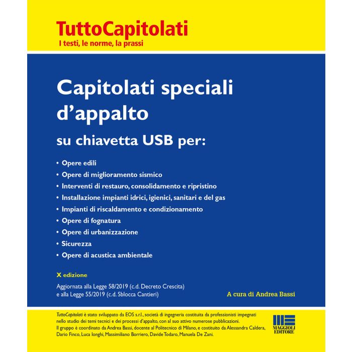 Una raccolta di Capitolati Speciali d'Appalto con una selezione di normativa e prassi. Il Capitolato Speciale d'Appalto è prescritto, quale documento contrattuale, dalla normativa sugli appalti pubblici. Negli anni si è verificato un sempre maggior utilizzo del Capitolato Speciale d'Appalto anche da parte di committenze private, diventando uno strumento privilegiato per definire le regole per una gestione tecnica ed economica efficace dell'appalto pubblico e privato. Quest'opera raccoglie i più utilizzati Capitolati Speciali d'Appalto, con la possibilità di personalizzazione da parte dell'utente. Il volume è strutturato in maniera tale da permettere un utilizzo veloce e intuitivo grazie anche alla facilità di navigazione. Tutti i Capitolati sono aggiornati alle recenti normative cogenti, in particolare al nuovo Codice degli appalti e al successivo decreto correttivo, e alle principali normative consensuali.