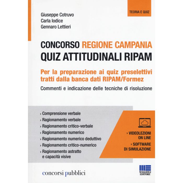 Il volume è un utilissimo strumento di preparazione alla prova preselettiva del concorso indetto dalla Regione Campania con la delibera della Giunta regionale pubblicata sul BUR n. 74 del 12 ottobre 2018, per circa 10.000 posti da assumere nei prossimi 2 anni a tempo indeterminato presso i vari enti locali della Regione. Il percorso di assunzione prevede una procedura di selezione gestita dal RIPAM/FORMEZ seguita da una fase successiva di formazione e 10 mesi di tirocinio retribuito. La fase concorsuale prevede lo svolgimento di due prove scritte e una orale. In caso di alto numero di candidati si svolgerà una prova preselettiva con test critico-verbali, logico-matematici e di abilità visiva. Il testo è un'esauriente guida per la soluzione dei quiz di logica assegnati nelle selezioni di tipo RIPAM/Formez, ed in particolare: quiz inerenti la comprensione verbale; quiz inerenti il ragionamento verbale; quiz inerenti il ragionamento critico-verbale; quiz inerenti il ragionamento numerico; quiz inerenti il ragionamento numerico-deduttivo; quiz inerenti il ragionamento critico-numerico; quiz inerenti il ragionamento astratto e le capacità visive. Grazie alle indicazioni fornite sulle modalità di svolgimento delle prove e sulle specifiche tecniche di risoluzione dei quesiti il candidato potrà padroneggiare gli strumenti per risolvere i quiz e non semplicemente tentare di memorizzare ogni singolo quesito presente nella banca dati di riferimento. Le tante batterie di quiz proposte nel volume garantiscono la possibilità di verificare il livello di preparazione raggiunto. Il volume è completato dalle videolezioni di Giuseppe Cotruvo su metodi e trucchi per risolvere i quiz e dal software di simulazione per esercitarsi sui quiz della banca dati RIPAM con le modalità delle prove reali.