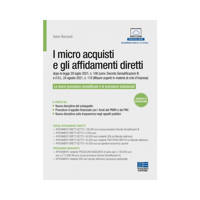 Particolare attenzione è dedicata alle procedure sotto soglia mediante affidamento diretto, delle quali vengono fornite 5 tipologie di determine: affidamenti sotto i 5.000 euro, affidamenti mediante ODA sul Mercato elettronico sotto i 40.000 euro, affidamenti mediante trattativa diretta sul Mercato elettronico sotto i 40.000 euro, affidamento diretto ad operatore uscente.