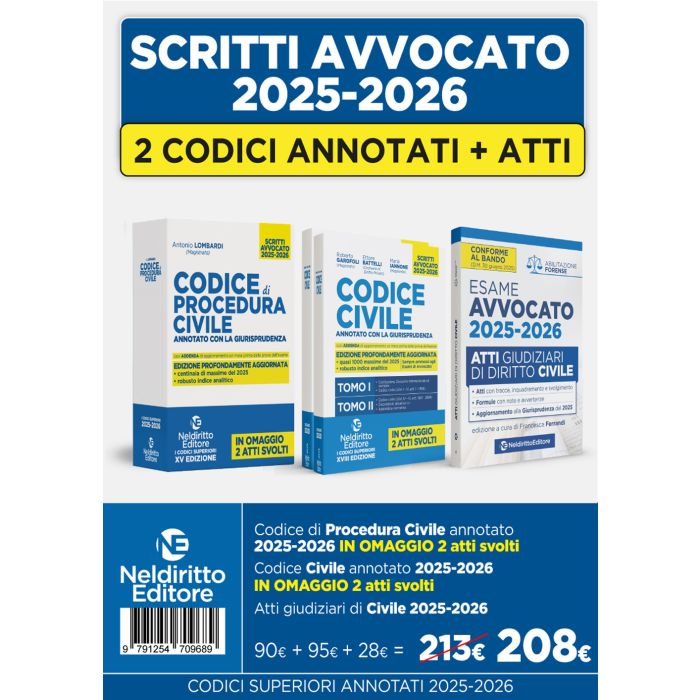 Anche nella sessione 2025-2026 è prevista, per l'esame di Stato per l'abilitazione alla professione di avvocato, la prova scritta, consistente nella redazione di un atto giudiziario. La prova orale, invece, sarà articolata in più fasi di cui la prima consiste nella soluzione di un caso. Sono destinati a essere nuovamente decisivi, pertanto, i Codici annotati, in specie quelli che garantiscono, completezza, aggiornamento, rapidità nella consultazione e nella ricerca delle massime pertinenti. I Codici Superiori annotati con giurisprudenza, Neldiritto Editore 2025 - da circa 20 anni diffusamente utilizzati da professionisti e aspiranti avvocati - sono il risultato dell'impegno profuso da giuristi autorevoli. Nelle Edizioni 2025-2026, i Codici, oltre che aggiornatissimi, sono profondamente ripensati, riorganizzati, arricchiti. Particolare impegno, anche in questa Edizione 2025-2026, è stato profuso nell'assicurare: l'aggiornamento dell'apparato normativo, la completezza e ricchezza delle questioni giurisprudenziali segnalate, la chiarezza delle massime riportate; la logicità dei sommari sotto le singole disposizioni, organizzati in modo da consentire l'agevole individuazione dei profili esaminati e l'intuitiva ricostruzione dei percorsi logici sottesi; la struttura grafica che favorisce un'agevole consultazione, anche grazie ad un uso sapiente della tecnica del grassetto; la particolare visibilità delle decisioni più recenti e di quelle degli organi nomofilattici; il puntuale aggiornamento alla giurisprudenza più recente, anche di merito. In questa Edizione sono state inserite numerosissime massime riferite alla giurisprudenza, anche europea, del 2025. È stato, infine, arricchito l'indice analitico. Tanto per il professionista quanto per chi deve sostenere le prove dell'esame di abilitazione forense è fondamentale poter individuare tempestivamente le massime che affrontano gli aspetti di diritto decisivi per la soluzione del caso. In questa prospettiva, l'indice è composto da migliaia di voci di cui numerose (distintamente evidenziate) che rinviano alle norme per le quali è intervenuta la giurisprudenza del 2025 e degli anni precedenti.