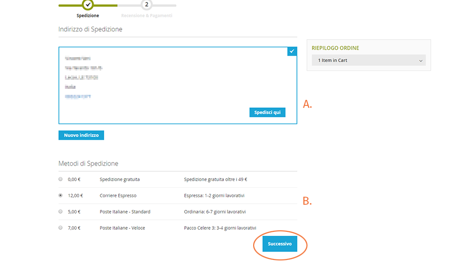 3. Inserisci tutte le informazioni per la spedizione o seleziona un indirizzo dalla tua rubrica. Seleziona la modalità di spedizione e clicca su Successivo