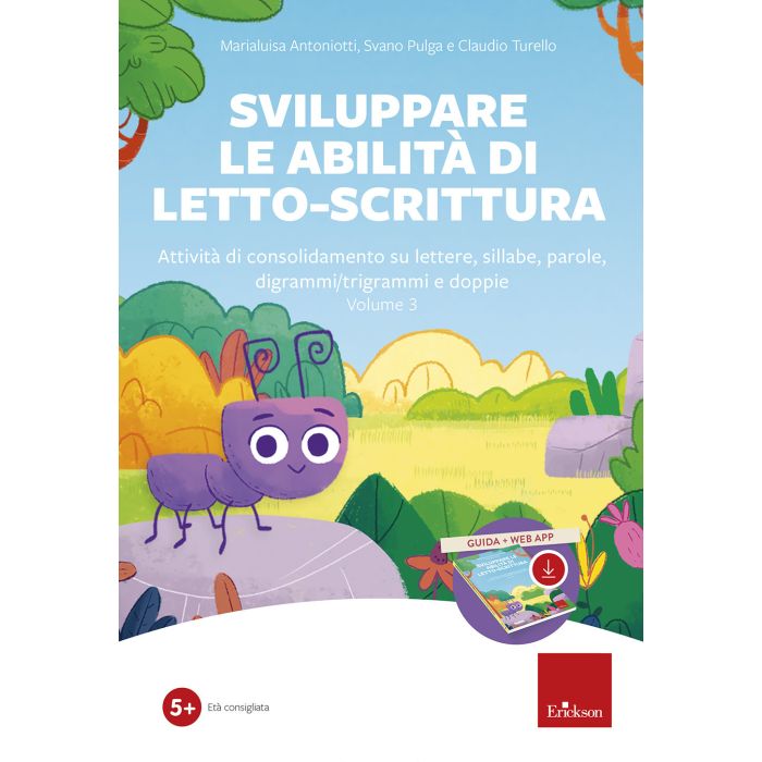 Il kit di Sviluppare le abilità di letto-scrittura 3 è un programma di recupero e potenziamento delle abilità di letto-scrittura in bambini e bambine della scuola primaria che presentano qualche difficoltà nell'automatizzazione dei sistemi linguistici della lingua italiana. Una raccolta di attività interattive e divertenti che possono aiutare i bambini con difficoltà nell'apprendimento della letto-scrittura nel consolidamento di lettere, sillabe, parole, digrammi/trigrammi e doppie. La guida presenta una breve introduzione teorica sulle fasi di sviluppo dell'apprendimento della lettura e della scrittura e propone un valido intervento di recupero e potenziamento delle possibili difficoltà fonologiche, fonetiche e ortografiche. Contiene inoltre una dettagliata descrizione degli obiettivi e delle modalità di ciascun esercizio e una pratica guida operativa all'uso della web app. La web app propone, sottoforma di simpatici esercizi, 11 diverse attività di letto-scrittura relative alla fase alfabetica della nostra lingua, all'ortografia e alla fonetica. Le attività seguono un percorso mirato alla: memorizzazione e identificazione del rapporto fonema/grafema; rappresentazione e lettura di parole a struttura fonotattica via via più complessa; memorizzazione e rappresentazione di strutture «opache» come digrammi e trigrammi, la percezione delle doppie e la loro rappresentazione. Tutti gli esercizi sono preceduti da una videata di opzioni dove l'adulto può scegliere le liste di parole, di lettere e di suoni su cui lavorare tra oltre 5000 stimoli random e la modalità di svolgimento degli esercizi.