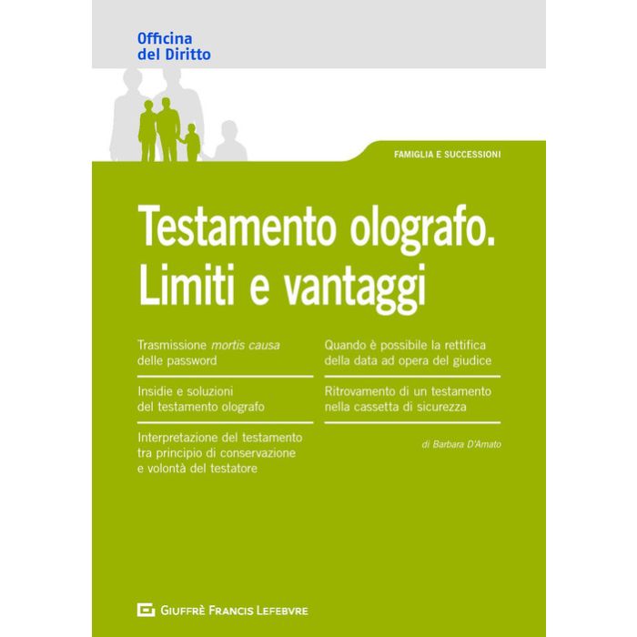 Officina del diritto: è uno strumento di lavoro e di studio pensato per arricchire le proprie conoscenze giuridiche attraverso un sistema di lettura strutturato su più livelli: uno più immediato che consente di focalizzare i concetti "guida" di una precisa fattispecie giuridica con l'utilizzo di esempi, tavole sinottiche, schemi, formule, quesiti, mappe giurisprudenziali, e un altro più approfondito che illustra organicamente la materia e nel quale si rinvengono informazioni puntuali e chiarimenti mirati di pronta fruibilità. L'opera "Testamento olografo. Limiti e vantaggi" affronta le seguenti tematiche: - Trasmissione mortis causa delle password; - Insidie e soluzioni del testamento olografo; - Interpretazione del testamento tra principio di conservazione e volontà del testatore; -Quando è possibile la rettifica della data ad opera del giudice; - Ritrovamento di un testamento nella cassetta di sicurezza.